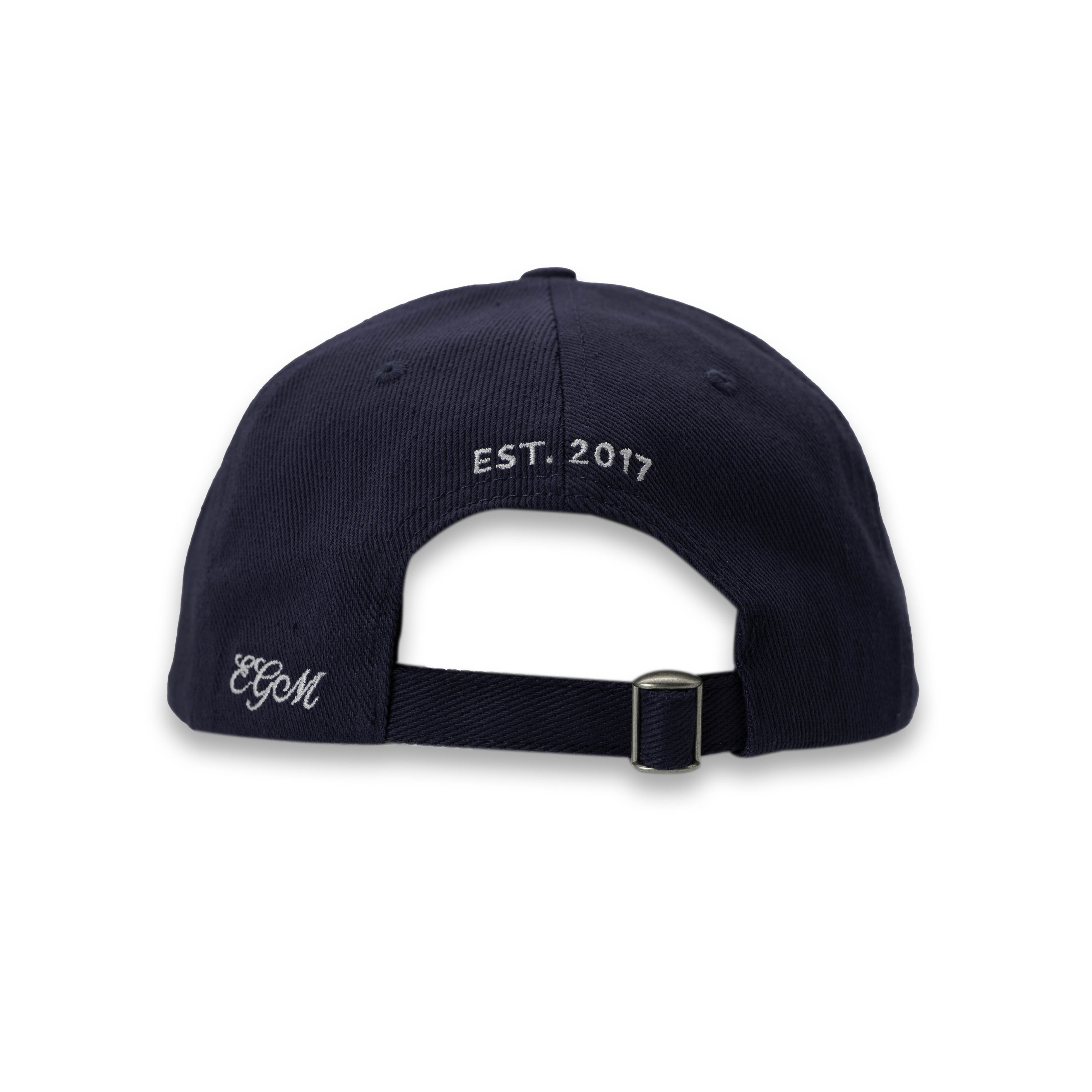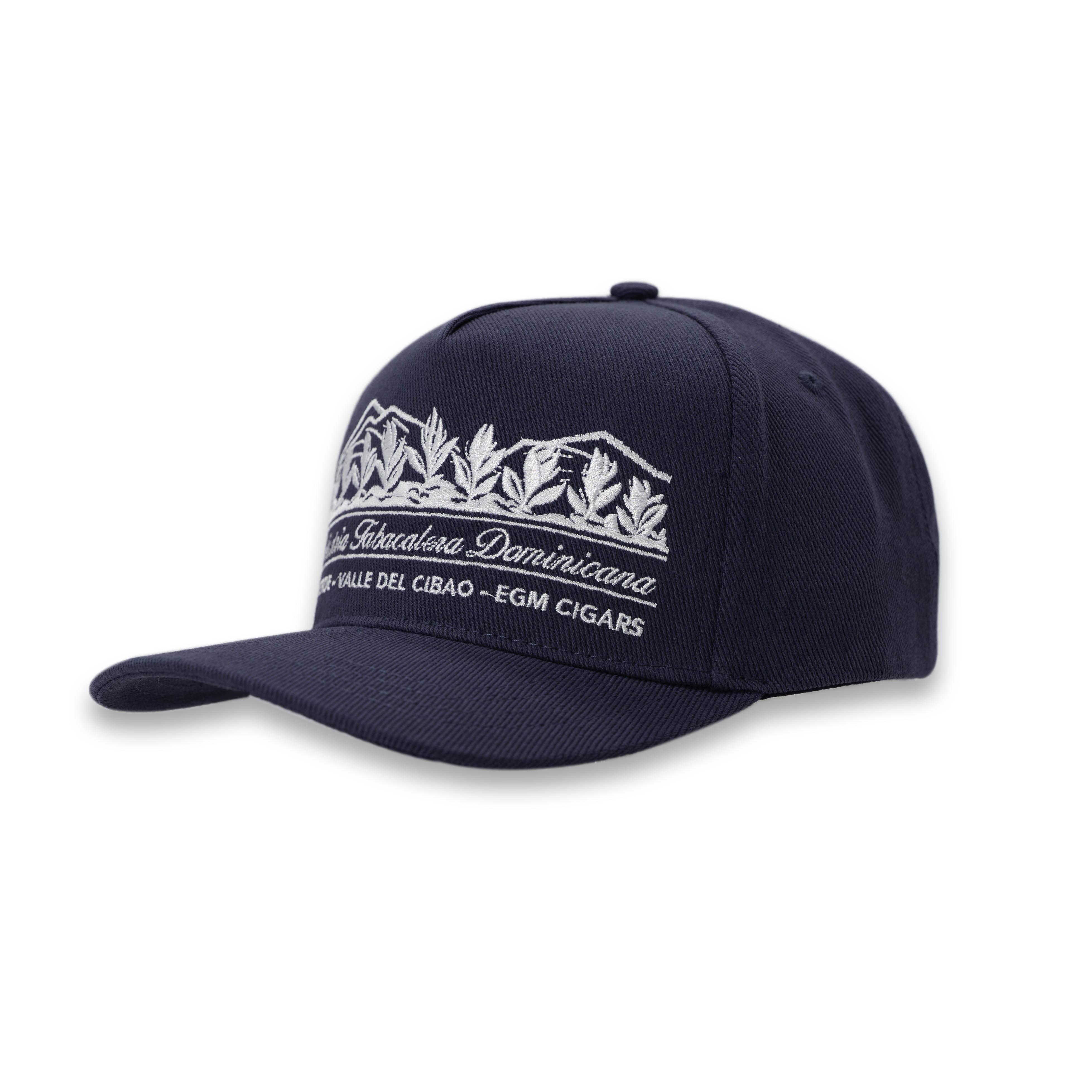 Navy cap with embroidered graphic and text: “Industria Tabacalera Dominicana – Valverde – Valle del Cibao – EGM Cigars”. Valle del Cibao is where our tobacco comes from, and “totalmente a mano” is how our cigars are made